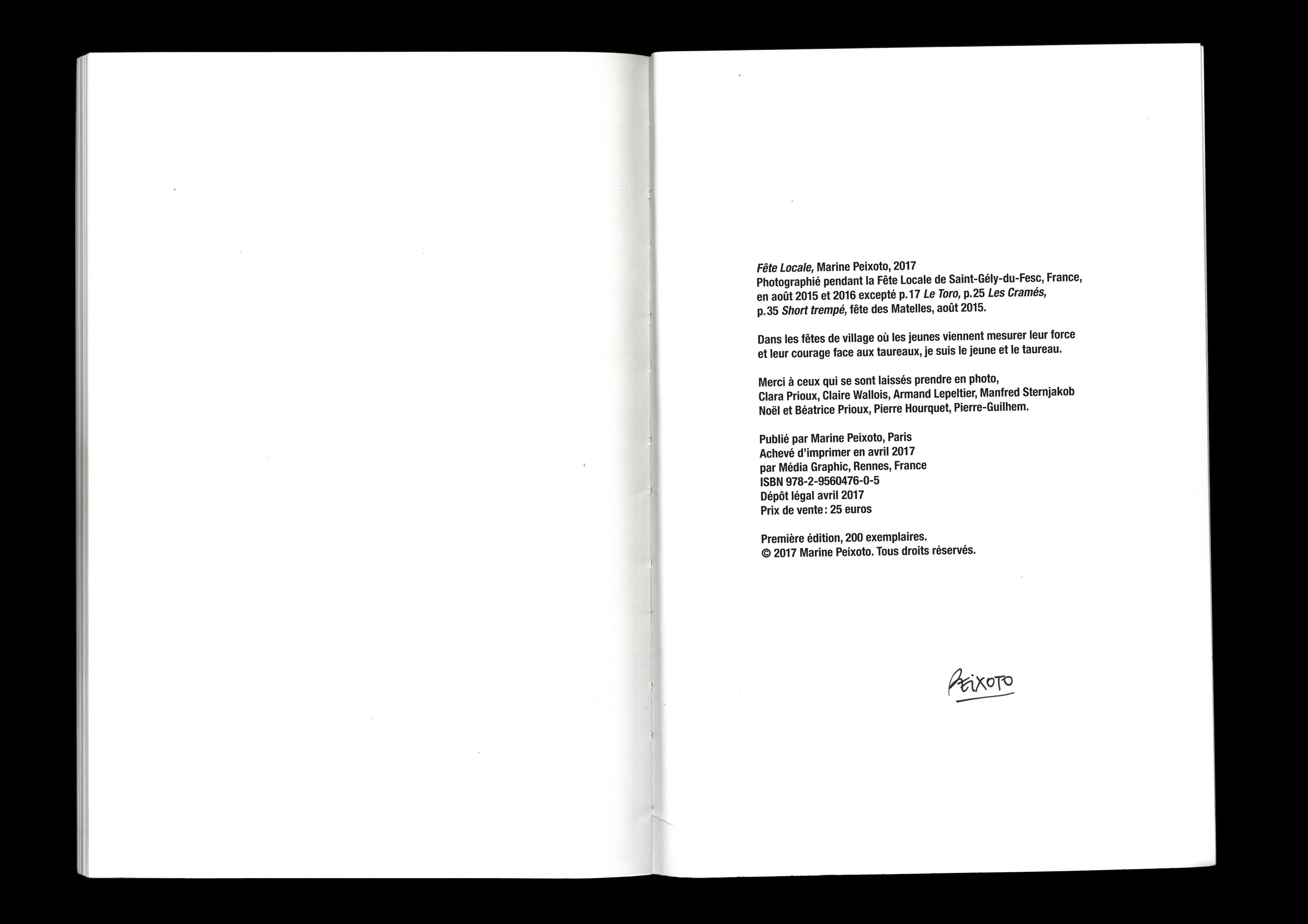 Fête Locale rassemble des photographies réalisées par Marine Peixoto principalement pendant la fête locale de Saint-Gély-du-Fesc en août 2015 et 2016. Peixoto dresse à travers cet ouvrage un portrait des fêtes de villages traditionnelles. Cette première édition tirée à 200 exemplaires est signée par l'artiste.