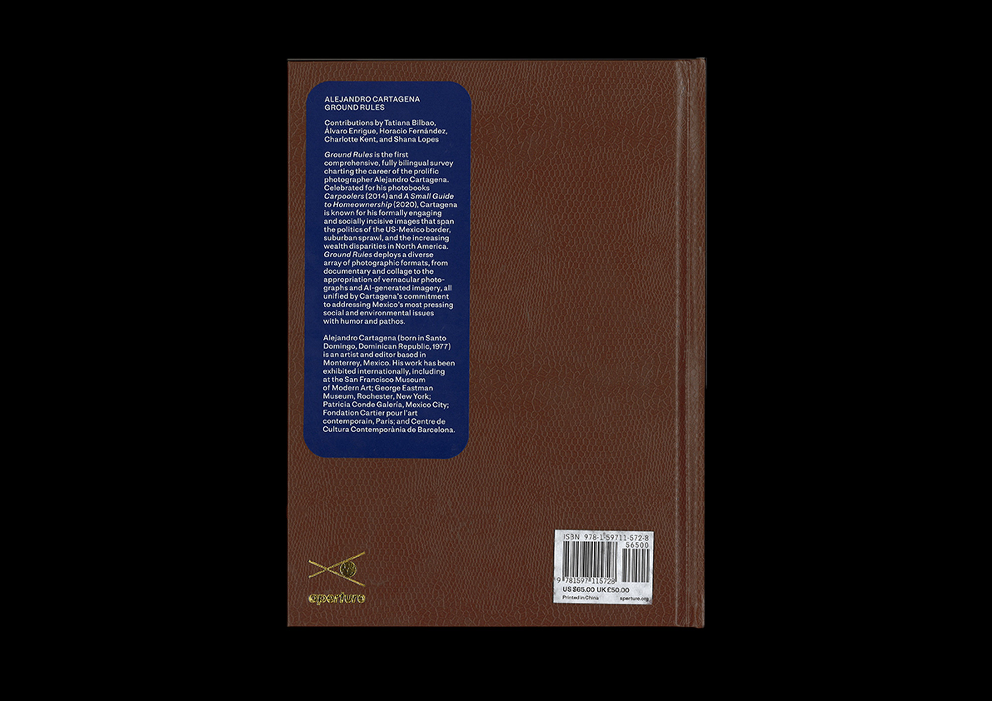 Ground Rules est la première enquête complète et bilingue sur la carrière du photographe prolifique Alejandro Cartagena. Célèbre pour ses livres de photos Carpoolers (2014) et A Small Guide to Homeownership (2020), Cartagena est connue pour ses images formellement engageantes et socialement incisives qui couvrent la politique de la frontière entre les États-Unis et le Mexique, l'étalement suburbain et les disparités croissantes en matière de richesse en Amérique du Nord. Ground Rules déploie un éventail diversifié de formats photographiques, du documentaire au collage en passant par l'appropriation de photographies vernaculaires et d'images générées par l'IA, le tout unifié par l'engagement de Carthagène à aborder les problèmes sociaux et environnementaux les plus urgents du Mexique avec humour et pathos ; textes de Tatiana Bilbao, Álvaro Enrigue, Horacio Fernández, Charlotte Kent et Shana Lopes, photos en n.b. et en couleurs.