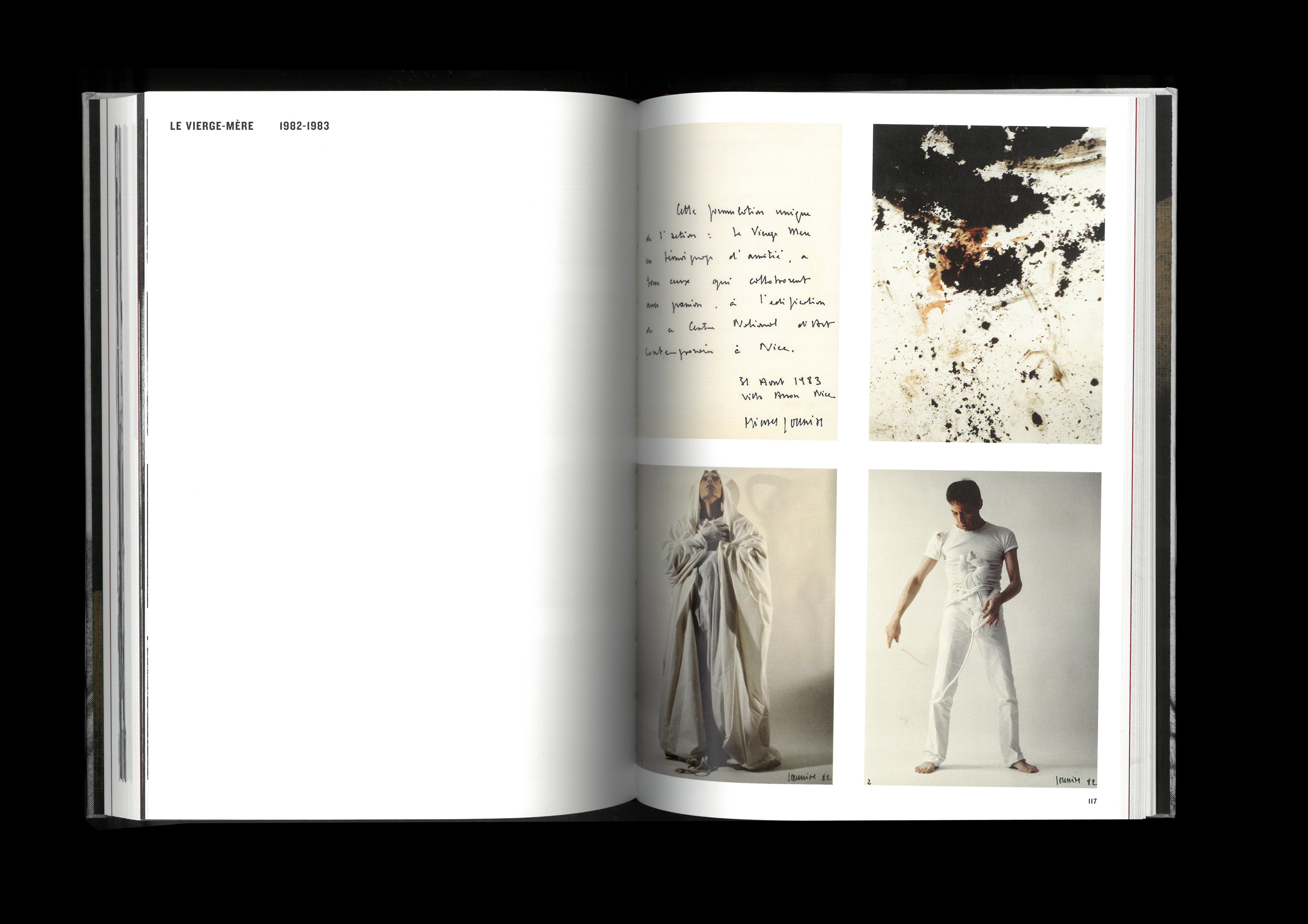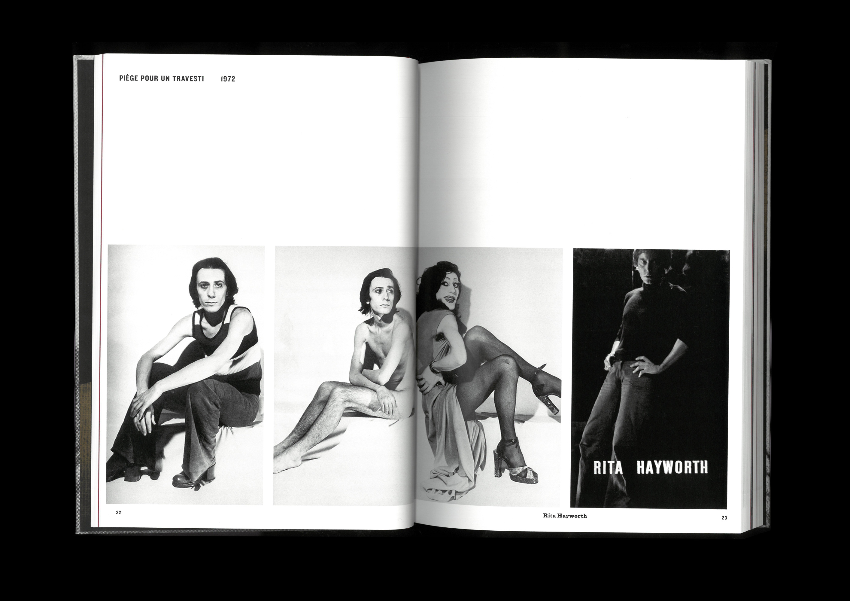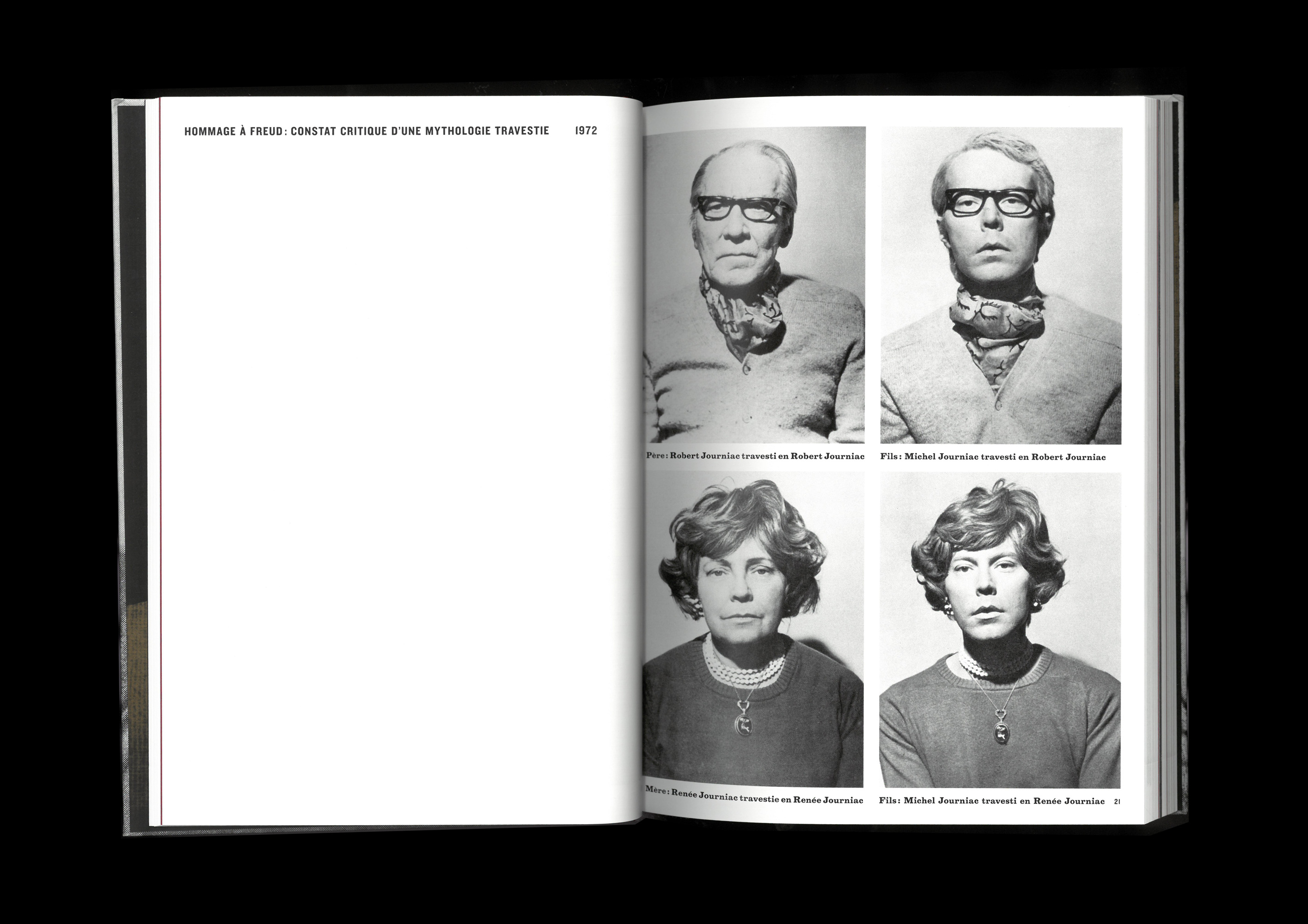 Pratiquant à la fois la poésie, l’installation, la performance et la sculpture, c’est par la photographie que Michel Journiac conserve en grande partie les traces de ses actions jouant de la parodie et le travestissement. Organisées en séries, ses « actions photographiques » se répartissent dans l’ouvrage sous trois ensembles : les Pièges et les séries où il apparaît en travesti ; les Rituels et les Contrats ; et, à partir de 1988, les Icônes du temps présent où le désir, la souffrance et la mort s’inscrivent en permanence dans ses images.