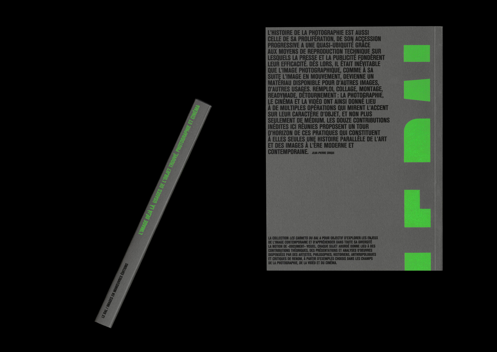 “L’histoire de la photographie est aussi celle de sa prolifération, de son accession progressive à une quasi-ubiquité grâce aux moyens de reproduction technique sur lesquels la presse et la publicité fondèrent leur efficacité.Dès lors, il était inévitable que l’image photographique, comme à sa suite l’image en mouvement, devienne un matériau disponible pour d’autres images, d’autres usages.Remploi, collage, montage, ready-made, détournement : la photographie, le cinéma et la vidéo ont ainsi donné lieu à de multiples opérations qui mirent l’accent sur leur caractère d’objet, et non plus seulement de médium. Les douze contributions inédites ici réunies proposent un tour d’horizon de ces pratiques qui constituent à elles seules une histoire parallèle de l’art et des images à l’ère moderne et contemporaine.” - Jean-Pierre Criqui, directeur éditorial du Carnets du BAL #2.