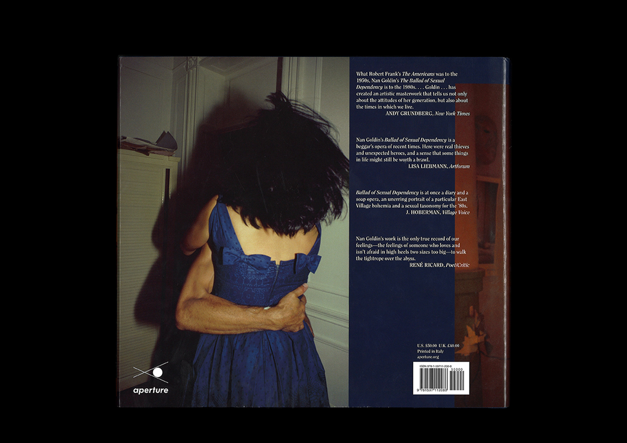 « Les vrais souvenirs que ces photographies éveillent sont des invocations à la couleur, à l’odeur, au son, à la présence physique, à la densité et au goût de la vie » écrit Nan Goldin. Grâce à un témoignage fidèle et précis de sa vie, The Ballad of Sexual Dependency, non seulement révèle l’odyssée personnelle de Nan Goldin, mais apporte une compréhension universelle du langage des hommes et des femmes. Au cours des dix dernières années, La ballade n’a cessé d’influencer la photographie et l’art en général, faisant de cet ouvrage un classique. Le récit de la vie urbaine et marginale réalisé par Nan Goldin a été le chant du cygne d’une époque qui trouva son apogée au début des années 80. Pourtant, il saisit un élément fondamental et transcendant chez l’homme : son besoin de s’unir.