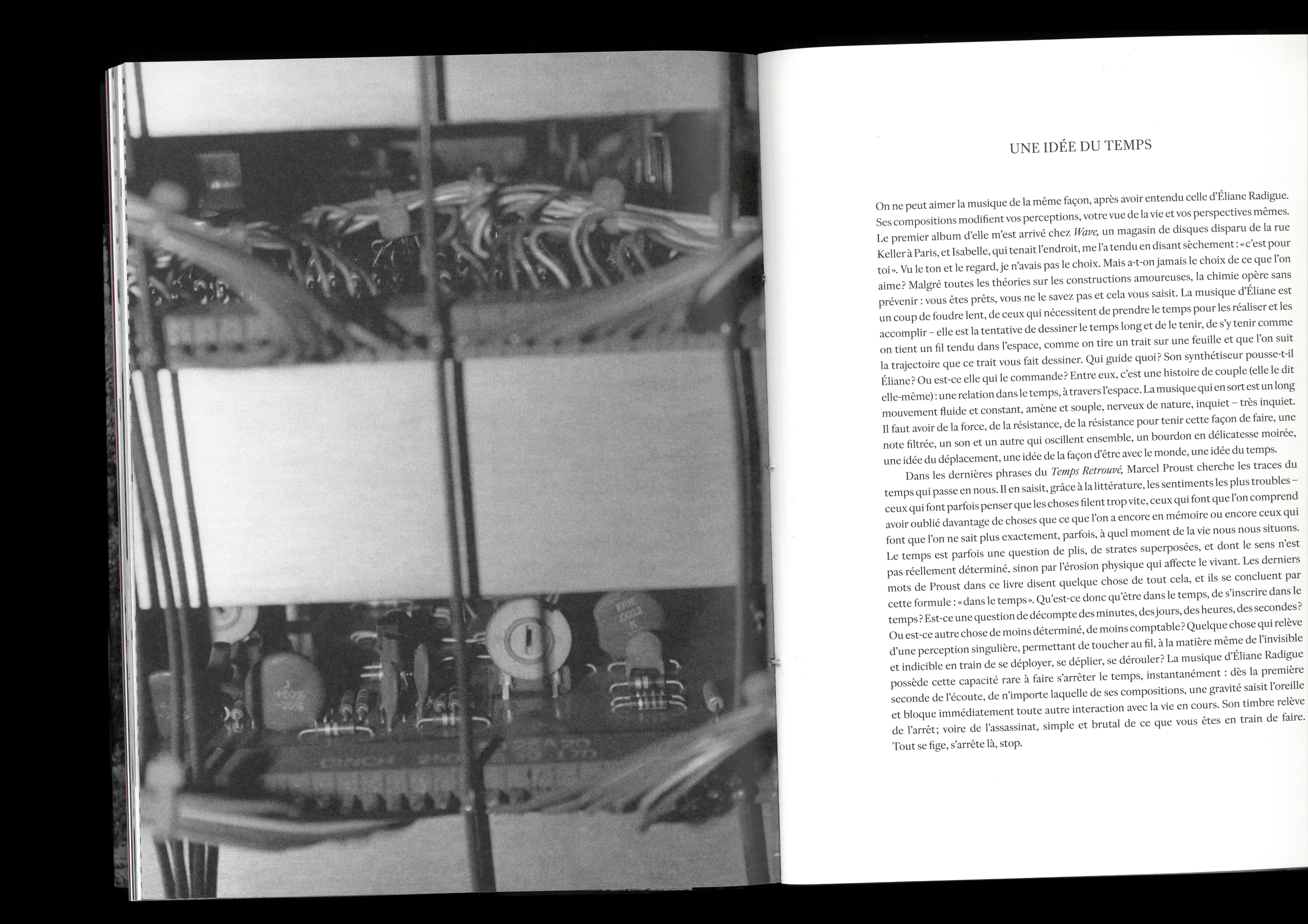 Une idée du temps est un ouvrage dédié à la compositrice française de musique minimaliste Eliane Radigue. Dédié aux archives photographiques de l'artiste, le livre mêle plusieurs portraits pris au cours des années ainsi que des images de ses instruments photographiés par Rebekka Deubner. De cette façon, l'édition rend hommage à la carrière de la pionnière de musique électronique aujourd'hui âgée de 92 ans et documente son lien avec son "partenaire", un ARP 2500.