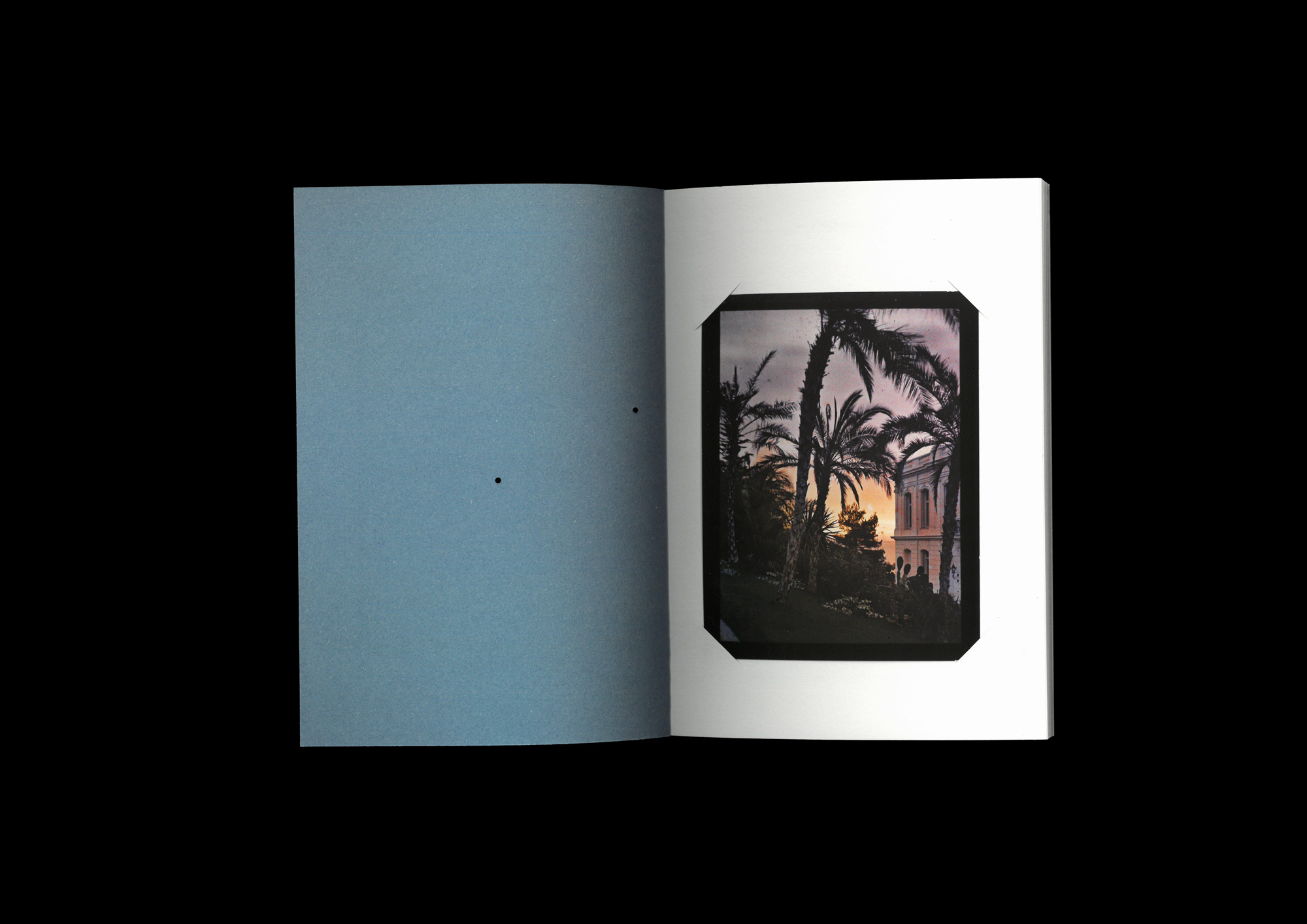 L’image vient juste avant la nuit. Bientôt, les ombres des palmiers vont gagner tout le ciel. Au-dessus de la zone plus mate de la mer, une lueur de feu s’apprête à sombrer. L’image arrête le temps, comme toutes les images, mais celle-ci semble échouer à le figer tout à fait. Déjà, on sait que le temps va gagner. Les teintes vont s’assombrir et la mer disparaître. On sent la fraîcheur humide venue de l’herbe et du rivage, le désir de l’abri.