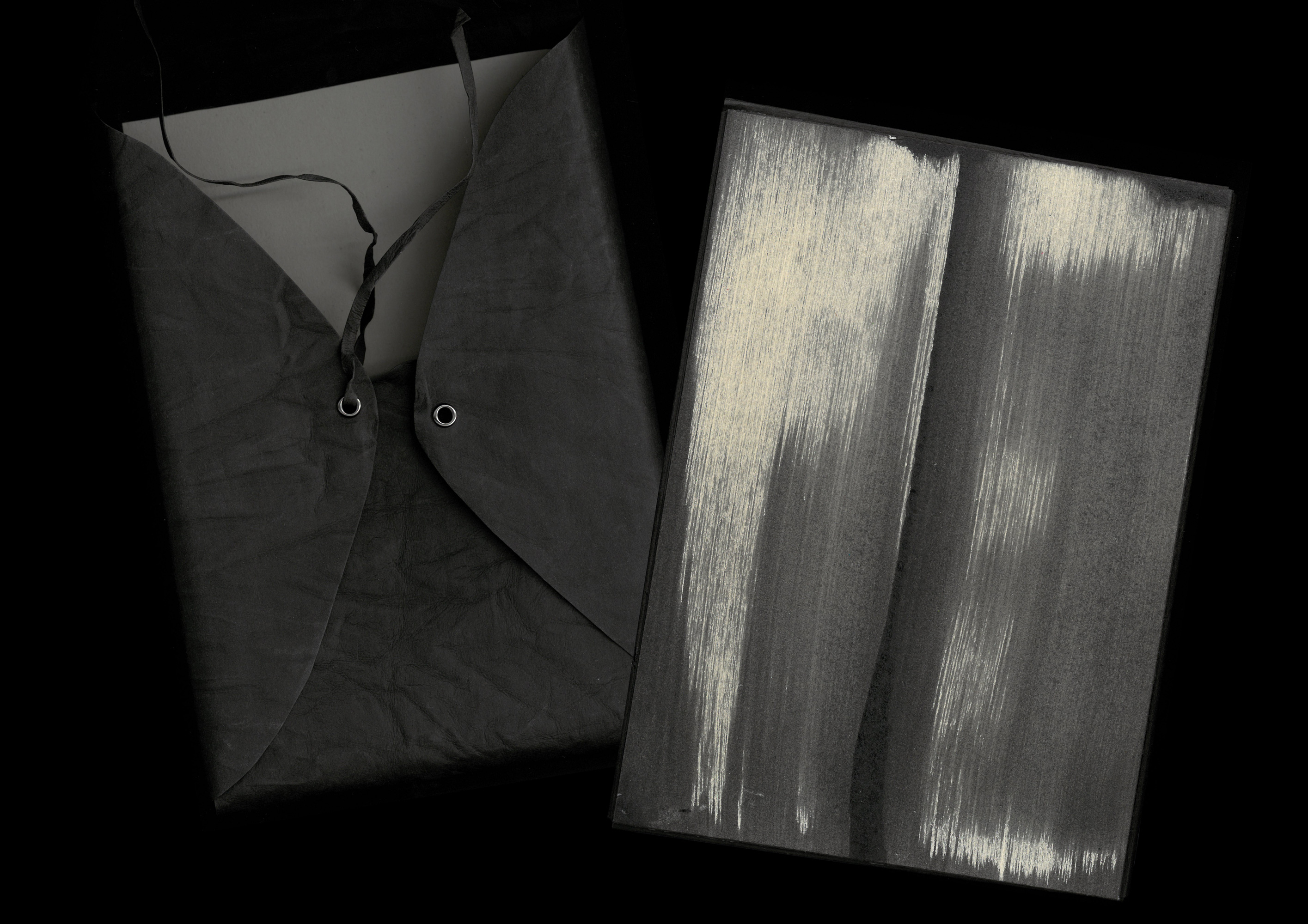 120 exemplaires numérotés et signés. Boîtier fait à la main en papier lavable (cuir végétalien) et en carton dur ; peint à l'encre de Chine au dos.