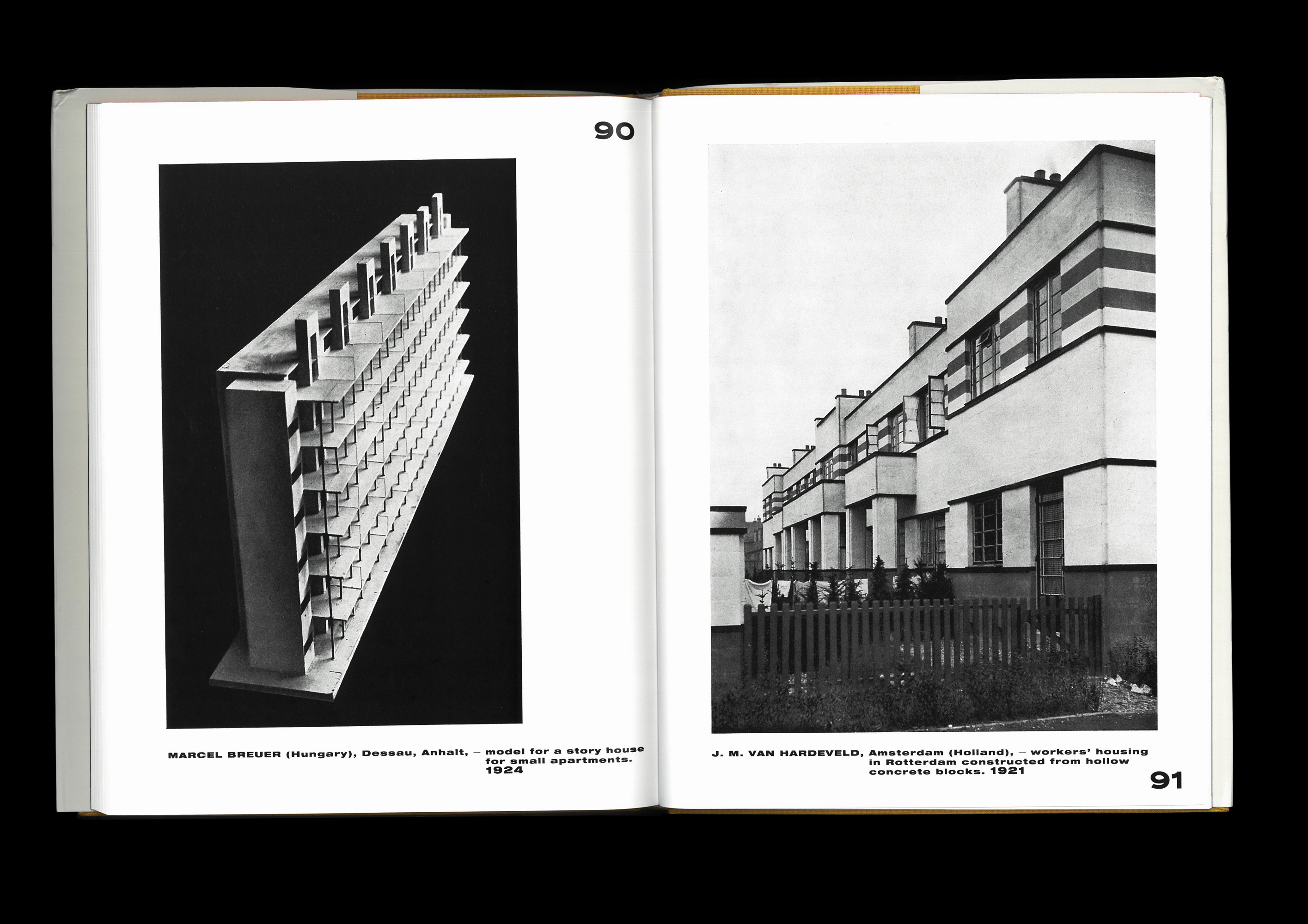 Lorsque le Bauhaus s'est installé à Dessau en 1924, il a enfin été possible de publier les premiers Bauhausbücher que Walter Gropius (1883-1969) et Làszlò Moholy-Nagy (1895-1946) avaient imaginés à Weimar. La série devait donner un aperçu des enseignements du Bauhaus et des possibilités qu'il offrait d'intégrer le design moderne dans les aspects quotidiens d'un monde de plus en plus moderne. Dans une brève préface, Gropius résume les principes directeurs qui, selon lui, unissent les avant-gardes du monde entier. Mais l'essentiel du livre est visuel, avec une vaste section illustrée présentant des bâtiments en Europe et en Amérique. Selon Gropius, ces illustrations montrent le « développement d'une vision cohérente du monde » qui a renoncé au rôle décoratif antérieur de l'architecture et s'est exprimée dans un nouveau langage d'exactitude, de fonctionnalité et de géométrie.